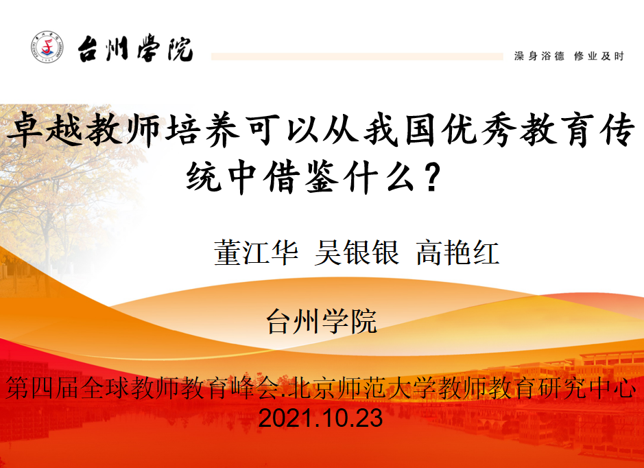 10月23日,由教育部普通高校人文社会科学重点研究基地北京师范大学教师教育研究中心发起主办的“第四届全球教师教育峰会(Global Teacher Education Summit,GTES2021)”在北京师范大学昌平校区盛大开幕。本届峰会主题为“全球视野下的教学与教师教育:政策、研究与实践”,峰会克服疫情带来的限制,采取线上和线下结合模式,全程同步开通线上直播、回放。我校教师教育学院董江华、吴银银、高艳红等三位博士应邀参会并作线上主题发言。