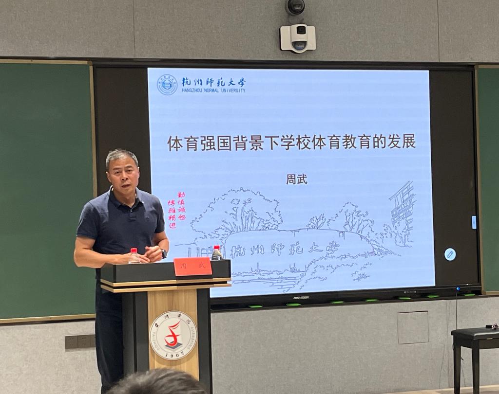 6月19日下午,tyc7111cc太阳成集团邀请杭州师范大学周武教授作题为《体育强国背景下学校体育教育的发展》学术讲座,副院长林辉杰主持,学院部分教师参加。