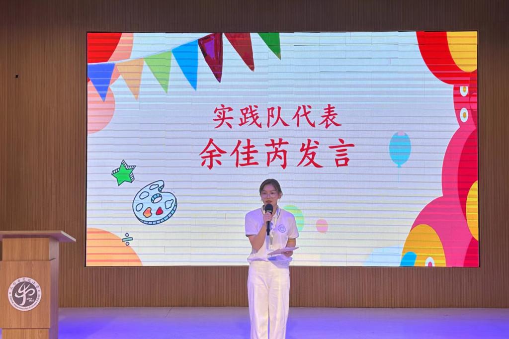 接着,由实践队代表余佳芮同学上台发言。余佳芮代表实践队员们对学校的欢迎和指导老师的教导表示衷心感谢,同时也强调了安全第一,希望队员们在安全顺利的前提下,将谦虚谨慎、虚心学习、团结互助、共同进步的理念贯彻于每日的教学活动中。