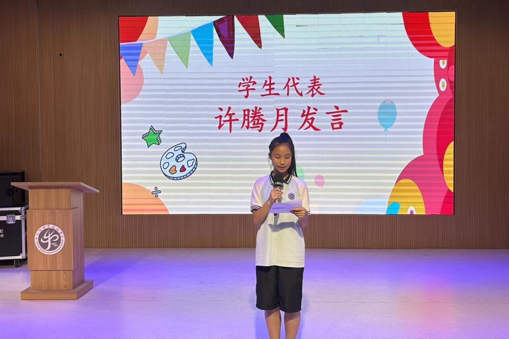 随后,暑托班的许腾月同学作为学生代表上台发言。许同学在发言时也提醒了暑托班的同学们要注意身体,并提出学习是个持之以恒的过程,希望同学们能学以致用、知行合一,以自强不息的精神来锻炼自己。