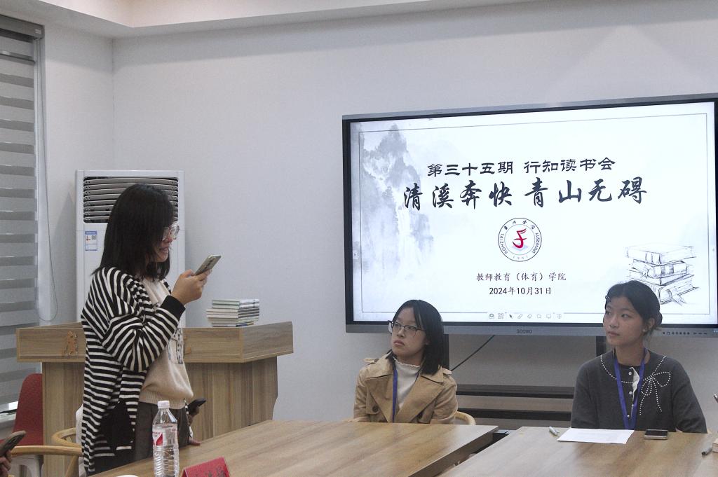 10月31日下午,tyc7111cc太阳成集团于广文书院素质工坊举办以“清溪奔快,青山无碍”为主题的行知读书会。此次读书会由刘叶同学主持,学院辅导员朱浩楠老师及2024级各班学生代表参加本次读书会。